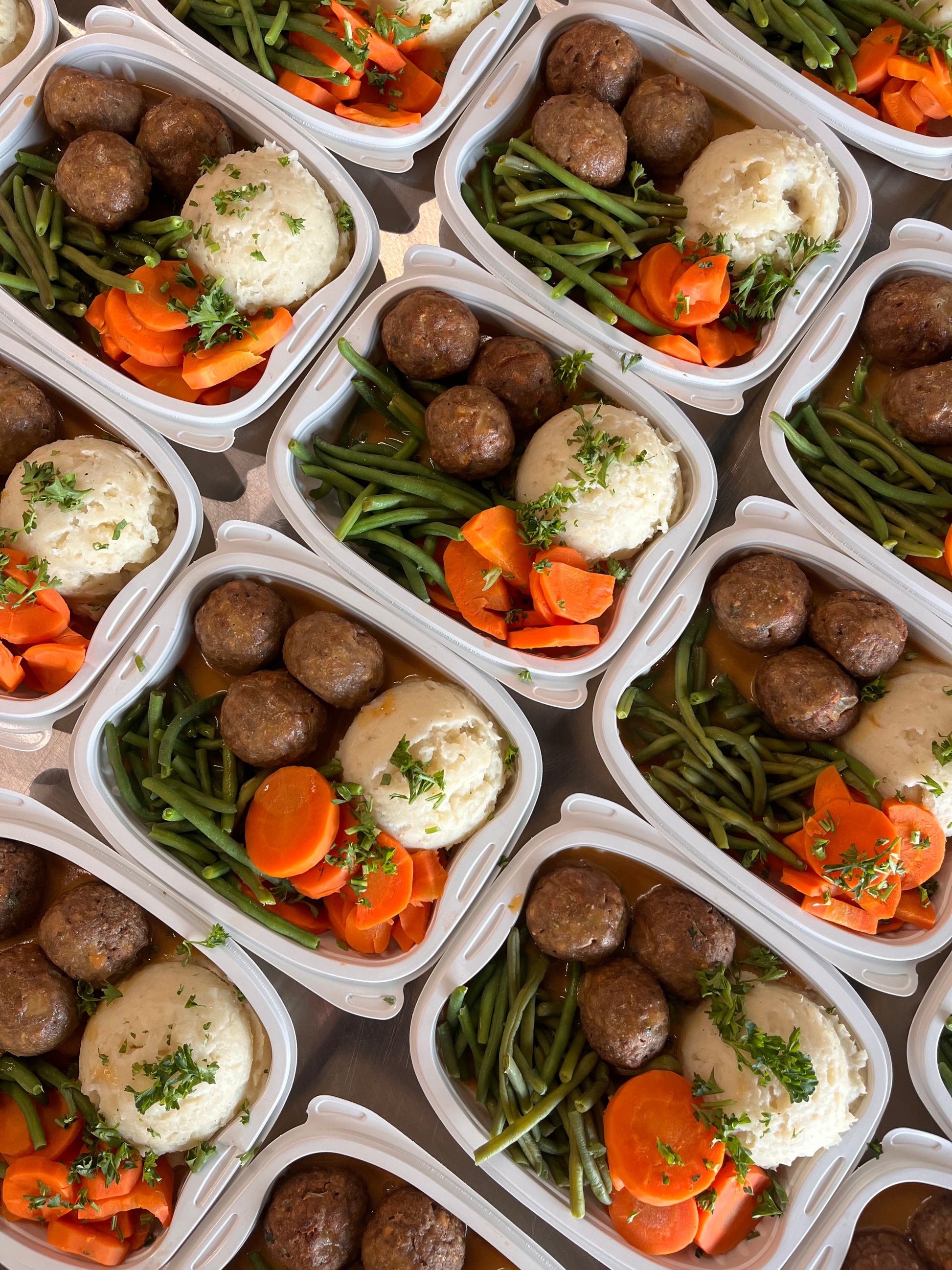 Boulettes de viande (3) et sauce gravy, patates pilées au beurre pois vertes et carotte.