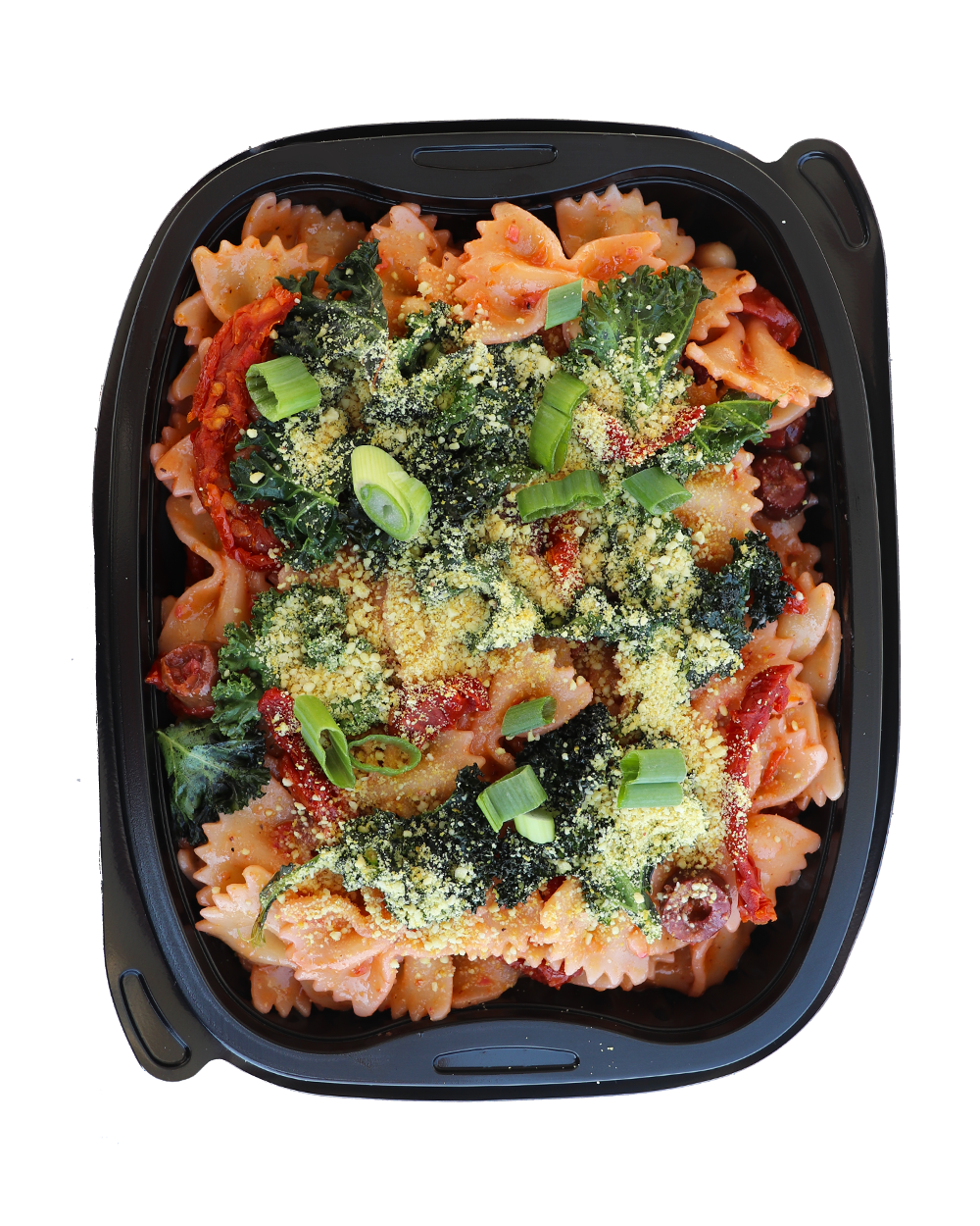 Pâtes farfalles, kale grillé et fèves blanches dans une sauce italienne aux tomates séchées, olives et vin blanc. Saupoudré de parmesan végétal et échalotes.